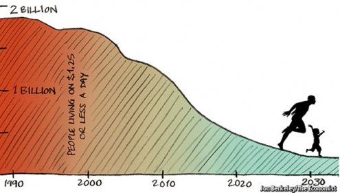 En su discurso inaugural en 1949, Harry Truman dijo que «más de la mitad de las personas del mundo viven en condiciones cercanas a la miseria. Por primera vez en la historia, la humanidad posee el conocimiento y la habilidad para aliviar el sufrimiento de las personas”. Nos ha llevado mucho más tiempo del que Truman esperaba, pero finalmente el mundo ha hecho progresos extraordinarios en sacar a la gente de la extrema pobreza. Entre 1990 y 2010, su número se redujo a la mitad como porcentaje de la población total de los países en desarrollo, del 43% al 21%, una reducción de casi mil millones de personas.