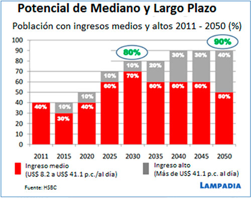 De acuerdo a las proyecciones del HSBC, al año 2030 el Perú contará con el 70% de su población ubicada en la clase media consolidada (con ingresos por persona y por día mayores a US$ 8.0), y un 10% en el grupo de altos ingresos, igualando a Chile y superando ampliamente a Colombia, que tendría solo al 50% de su población en los grupos de ingresos medios y altos. (L): Perú: Imparable crecimiento de la clase media.