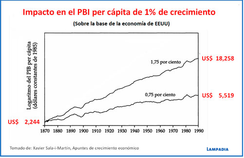 Como señala el reconocido economista de la Universidad de Columbia (EEUU), Xavier Sala-i-Martín: “No es difícil darse cuenta de que pequeñas diferencias en la tasa de crecimiento [PBI], sostenidas durante largos periodos de tiempo generan enormes diferencias en niveles de renta per cápita. Por poner un ejemplo, el Producto Bruto Interno (PBI) per cápita de los Estados Unidos pasó de 2,444 dólares en 1870 a 18,258 dólares en 1990. Ambas cifras en dólares reales de 1985. Es decir en poco más de un siglo, el PBI se multiplicó por ocho. Este cambio sustancial, que representó una tasa de crecimiento anual de 1.75%, convirtió a los EE.UU en el país más rico del mundo. (…) Consideremos ahora lo que hubiera pasado si el mismo país hubiera crecido al 0.75%… El nivel de 1990 no habría sido de 18,258 dólares sino de 5,519 dólares: menos de la tercera parte. Esto significa que, en lugar de ser el país más rico del mundo, EE.UU tendría una renta per cápita del nivel de México o Hungría y disfrutaría de 1,000 dólares por persona menos que Portugal o Grecia. ¡Y la diferencia entre uno y otro escenario es solamente de un punto porcentual!” (Ver gráfico).
