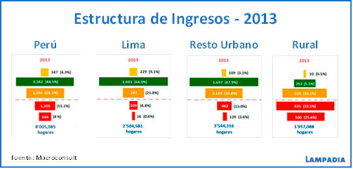 Pero más importante aún que este fenómeno, es que, como ha demostrado Elmer Cuba de Macroconsult, “entre 2004 y 2013 la forma de la pirámide de ingresos ha cambiado a un rombo”. Esto se aplica en el conjunto del país, en los sectores urbanos y rurales. (Ver en L: La Rumba del Rombo).