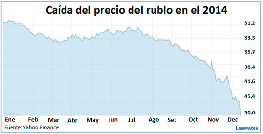 La economía rusa se está contrayendo, así como sus reservas de divisas, al tiempo que Rusia se enfrenta a pagos de deuda externa de más de US$ 700 mil millones y sanciones que han ahogado el acceso a los mercados de capitales globales. «Los vínculos económicos y financieros directos entre Rusia y gran parte del resto del mundo son relativamente pequeños», dice The Economist. Sin embargo, «las consecuencias devastadoras que el precio actual del petróleo tendrá sobre la economía de Rusia y su sistema financiero cargado de deuda en dólares, sugieren que este problema no podrá ser completamente restaurado en el corto plazo.» El mismo Putin ha advertido ayer (18/12/14) que la crisis durará por lo menos dos años.