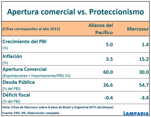 La Alianza del Pacífico reúne a países cuyas economías siguen creciendo a un buen ritmo a pesar del difícil contexto internacional, tienen menor inflación, deuda pública y déficit fiscal, en comparación con los países del Mercosur.