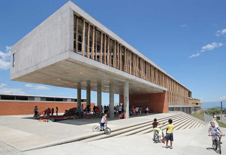 Finalmente, es importante reflexionar también sobre las posibilidades que ofrece la escuela como edificio público, y sobre el rol que puede tener la escuela frente a la ciudadanía en un pueblo, un barrio o un distrito. Ciertamente, la construcción e implementación de una escuela nueva en el Perú es materia de todos los años y; si se piensa más allá de los que se ofrece hoy en día con los centros escolares, se puede ir mucho más lejos. ¿Puede la escuela ofrecer espacio público a la ciudad? Definitivamente. Y en países como el nuestro, en donde el colegio ofrece también servicios a la ciudadanía como clases nocturnas, enseñanzas técnicas, acceso a bibliotecas y lugares de estudio; es un deber aproximar a la estructura física de la educación de una manera distinta. Es el caso de la Institución Educativa La Samaria, también en Colombia, en donde «el esquema libera una plaza pública cubierta en la esquina principal del barrio, comportándose como un amortiguador entre la vida del barrio y la actividad del colegio, ofreciendo un espacio para el disfrute de los habitantes y vinculando a la institución con la comunidad».