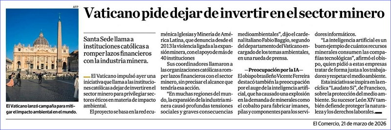 He visto con sorpresa, que la Santa Sede llama a las instituciones católicas a romper lazos financieros con la industria minera. “En muchas regiones del mundo, la expanción de la industria minera causó profundas tensiones sociales y graves consecuencias medioambientales” (Cardenal Fabio Baggio).