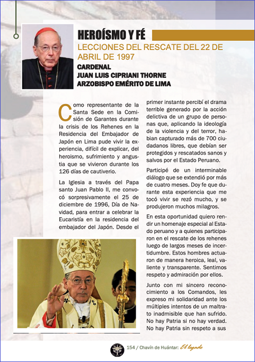Así como que haya deslucido el liderazgo del Almirante Luis Giampietri, el aporte estratégico y valeroso del Cardenal Juan Luis Cipriani, y que haya omitido una condena a quienes injustamente persiguieron, luego del rescate, a los Comandos Chavín de Huantar.