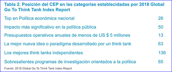 De acuerdo a las categorías que establece el ranking, el CEP se destaca en los siguientes lugares a nivel mundial: