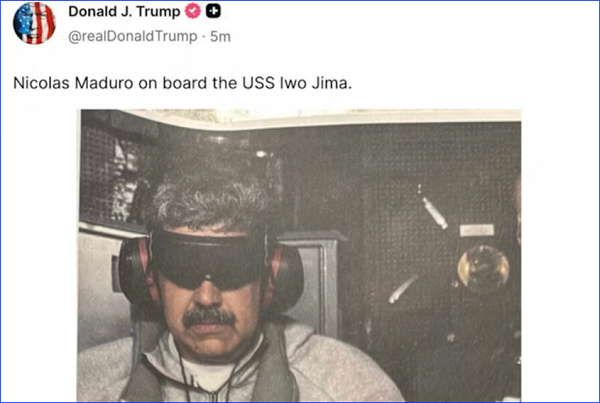 El líder venezolano y su esposa, Cilia Flores, fueron trasladados en helicóptero al USS Iwo Jima. Una foto publicada por Trump en redes sociales mostraba a Maduro a bordo del buque de guerra, con los ojos vendados y las manos atadas.