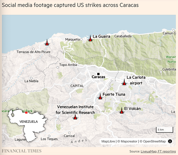 Fuera de la capital, La Guaira, el principal puerto marítimo de Venezuela, a 30 kilómetros al norte, también fue alcanzado, según imágenes de redes sociales verificadas por el FT.