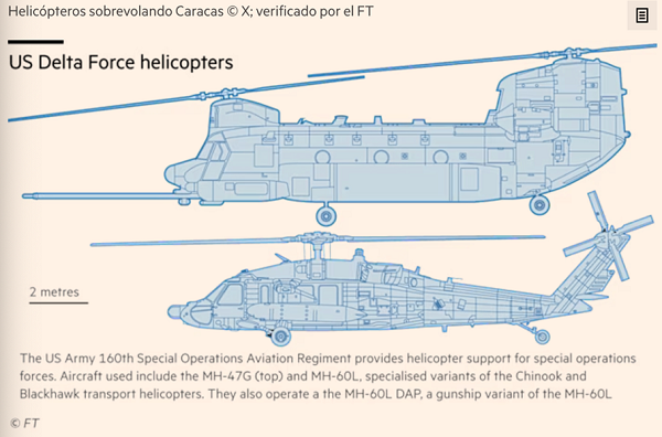 Varios videos publicados en redes sociales mostraron imágenes de helicópteros CH-47 Chinook sobrevolando Caracas. En uno de ellos, se veía una pértiga de reabastecimiento en vuelo.