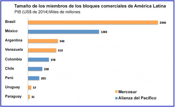 La Alianza del Pacífico es un bloque comercial latinoamericano formado en 2011 por Chile, Colombia, México y Perú. Los cuatro países en conjunto tienen una población de alrededor de 221.3 millones de personas y un PBI de US$2’100 millones. El Mercado Común del Sur (Mercosur), creado en 1991, incluye a Argentina, Brasil, Paraguay, Uruguay y Venezuela. Los cinco países suman 285 millones de habitantes y un PBI de US$3’500 millones.