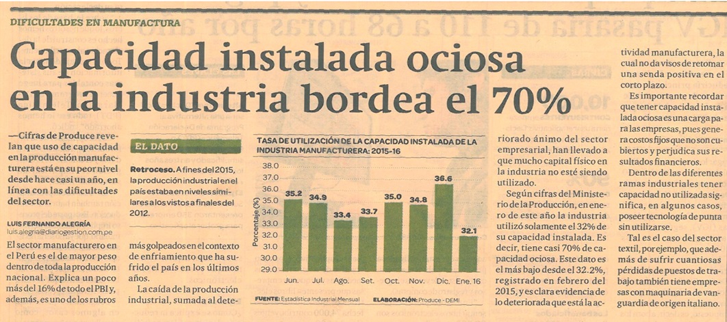 El pasado viernes 15 de abril, el Diario Gestión, página 11, publicó la nota que reproducimos líneas abajo en la que afirmaron que el 70% de la industria peruana estaba ociosa. Peor aún, la nota de marras se basaba en una publicación de PRODUCE, el Ministerio de la Producción.