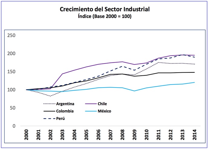 Como puede apreciarse en el gráfico, la performance del sector industrial peruano entre el año 2000 y 2014 ha sido superior a la de los países presentados e igual a la de Chile (país del que nos habíamos alejado) para luego alcanzar su ritmo de crecimiento nuevamente. Sin embargo, según los reportes de los gobiernos de los mismos países, el Perú estaría en medio de un colapso del sector industrial. Ver los reportes oficiales de utilización de capacidad instalada en el siguiente cuadro: