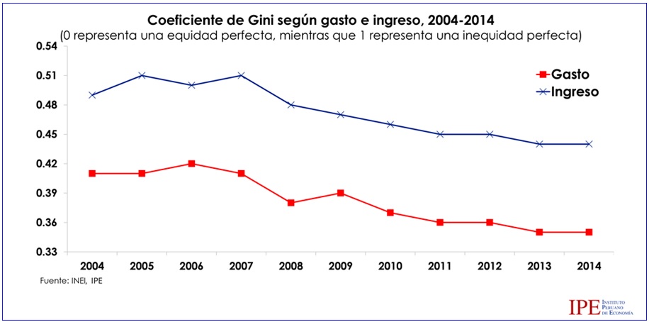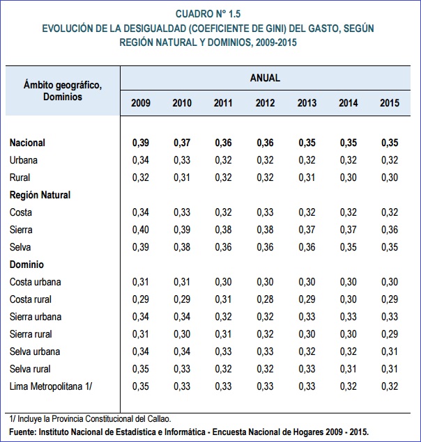 Estas afirmaciones se ven reforzadas con la recién publicada Encuesta Nacional de Hogares 2009 – 2015, del INEI, la cual muestra que en el 2015, el Perú alcanzó una desigualdad (coeficiente de GINI) del gasto de 0.35 a nivel nacional, a nivel de área geográfica para el área urbana fue 0.32 y para el área rural 0.30.