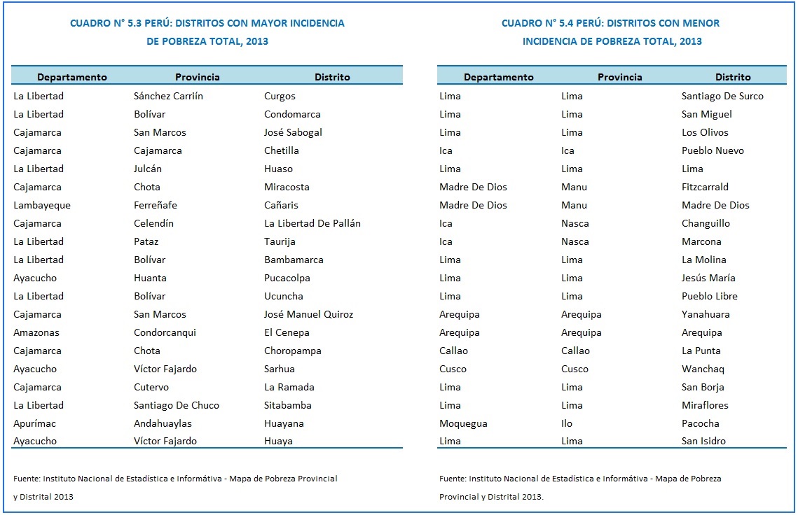 A nivel nacional, según los resultados del INEI, los 20 distritos más pobres del país (con mayor incidencia de pobreza) se encuentran ubicados en seis departamentos predominantemente de la región Sierra de nuestro país: