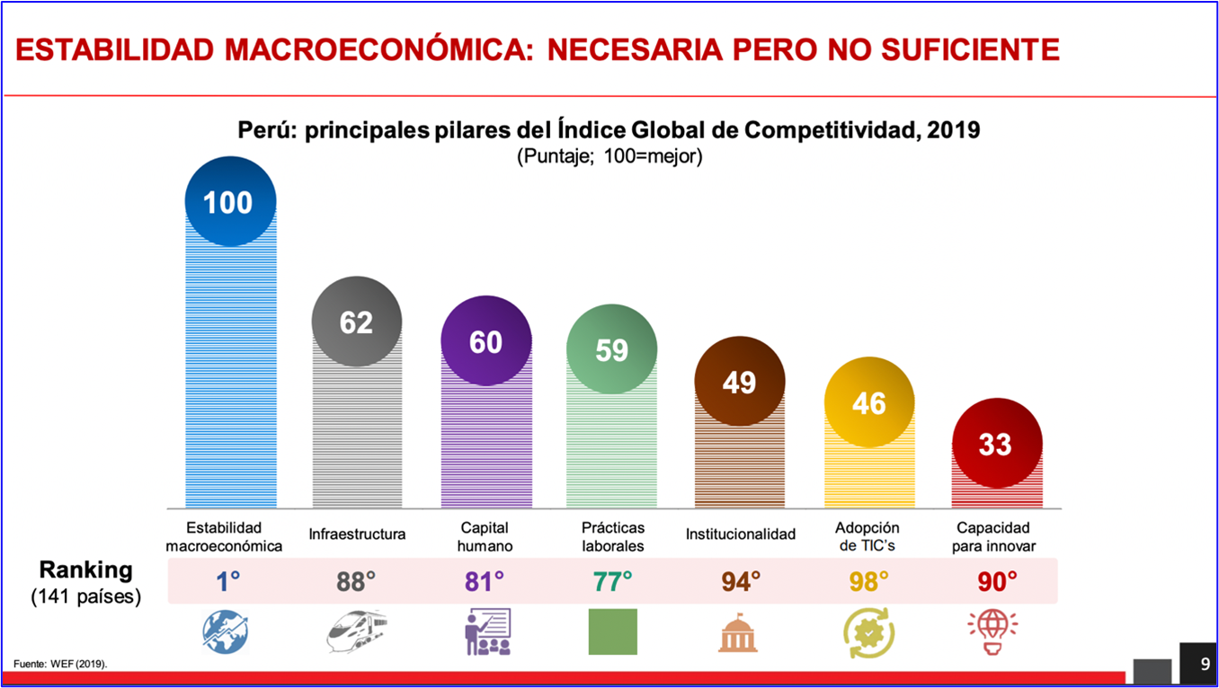 Pero el avance en los temas macroeconómicos no fue acompañado de desarrollos en salud, infraestructuras, instituciones y otras. Hubo recursos, pero también mala gestión, corrupción y falta de visión. Veamos el ranking del World Economic Forum.
