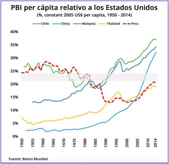 Sin embargo, como hemos repetido incansablemente, la tarea de salir de la pobreza esta a medio hacer. Tal vez la mejor ilustración del estadío de nuestro desarrollo se puede apreciar en el siguiente gráfico, en el que se reporta la evolución de nuestro PBI per cápita vis- à -vis el de EEUU, Chile, China, Malasia y Tailandia desde 1950 hasta el 2014.