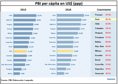 Nadie puede negar el importante crecimiento económico del Perú de la última década, 7% anual promedio. No es de sorprender, entonces, que los ojos del mundo estén puestos en nuestro desempeño. Recientemente el FMI (Fondo Monetario Internacional) ha publicado su informe de Perspectivas de la Economía Mundial. Señala que el PBI per cápita de Perú, ajustado por paridad de poder de compra, crecerá en 35% en los próximos cinco años y tendrá la mejor tasa de crecimiento entre todos los países de América Latina después de Panamá.