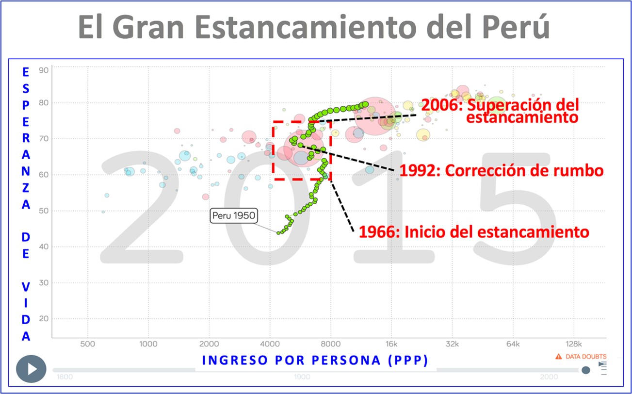 En el Perú hemos tenido terribles experiencias de estancamiento, aquí podemos ver, con el mismo software, cómo estuvimos paralizadosmás de 30 años, mientras el mundo avanzaba, nosotros estábamos estancados, apagamos las luces, se prohibió la inversión privada en todos los sectores, se regimentó a la sociedad, albergamos desde entonces esa inflación que terminó en híper inflación que destruyó la vocación de nuestros servidores públicos, porque una vez que la inflación destruyó sus ingresos y tuvieron que recurrir a agenciarse ingresos en otro lugar, perdieron su identidad como servidores públicos, los maestros, los policías, las enfermeras, el propio Estado les concedió tiempo libre para que vean cómo obtenían más ingresos, esa inflación que empezó con el gobierno de la dictadura militar y terminó en euforia con García I. Esa inflación destruyó el alma de los servidores públicos.