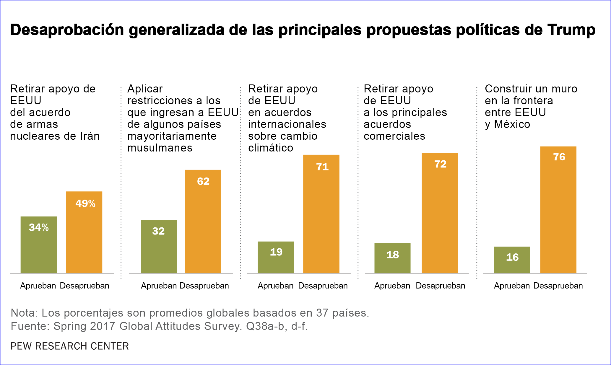 Su impopularidad es el resultado de una mezcla de desacuerdos con sus objetivos políticos, como construir un muro a lo largo de la frontera con México, y con el disgusto originado en su carácter, según Pew. Y es que ninguna de las principales políticas de Trump es popular. Por ejemplo, el muro que la Casa Blanca quiere construir en la frontera con México despierta un rechazo del 78% de los peruanos. La decisión de Trump de retirarse del Acuerdo Climático de París es mal vista en el Perú por el 65% y nuestro rechazo a su proteccionismo comercial es de 72%.