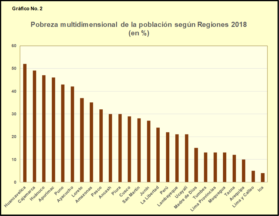 Por su parte en el Cuadro Nº 2, que corresponde a la pobreza multidimensional, se puede observar que los porcentajes de pobreza dados a conocer por el IPE, para las regiones antes señaladas (a partir de información del INEI), son los siguientes: Apurímac (46%), Pasco (32%), Ancash (30%), Cusco (29%), Junín (27%), Madre de Dios (15%), Moquegua (13%), Tacna (12%) y Arequipa (10%).