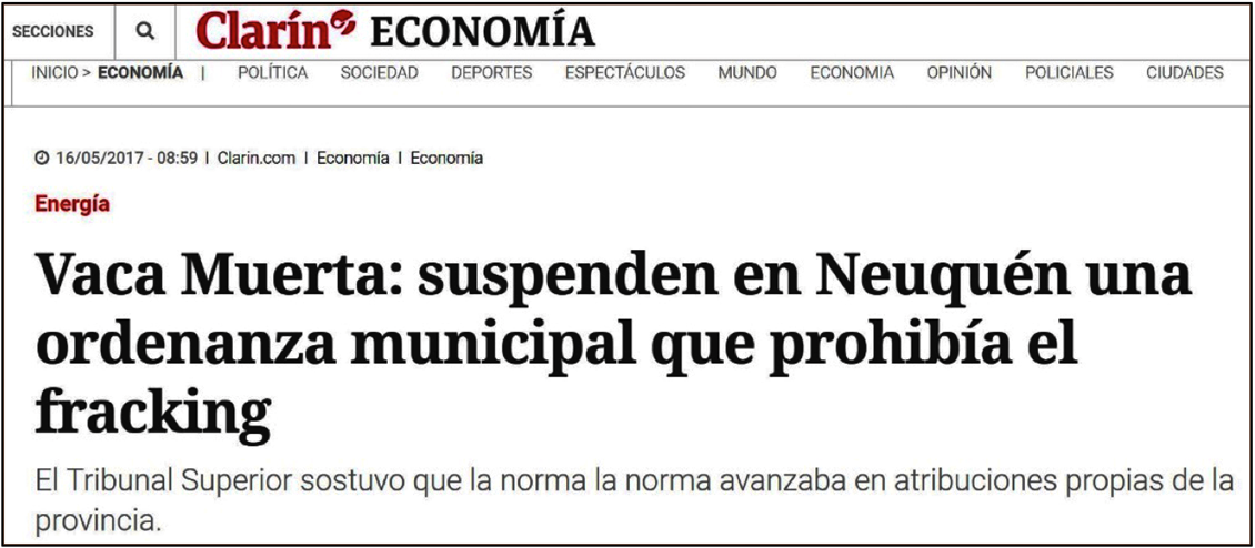 En Neuquén Argentina, la Municipalidad de Vista Alegre emitió la Ordenanza 783/16[i] la cual prohibía el uso del fracking(gas esquisto) en dicho territorio. En esta zona se encuentra el yacimiento de hidrocarburos de Vaca Muerta cuyo aprovechamiento implicaría una inversión cercana a los 4,000 millones de dólares para el 2018 y podría inclusive llegar a 20,000 millones hacia el 2019.[ii] EL frackingsería la principal modalidad de acceso para estos recursos.
