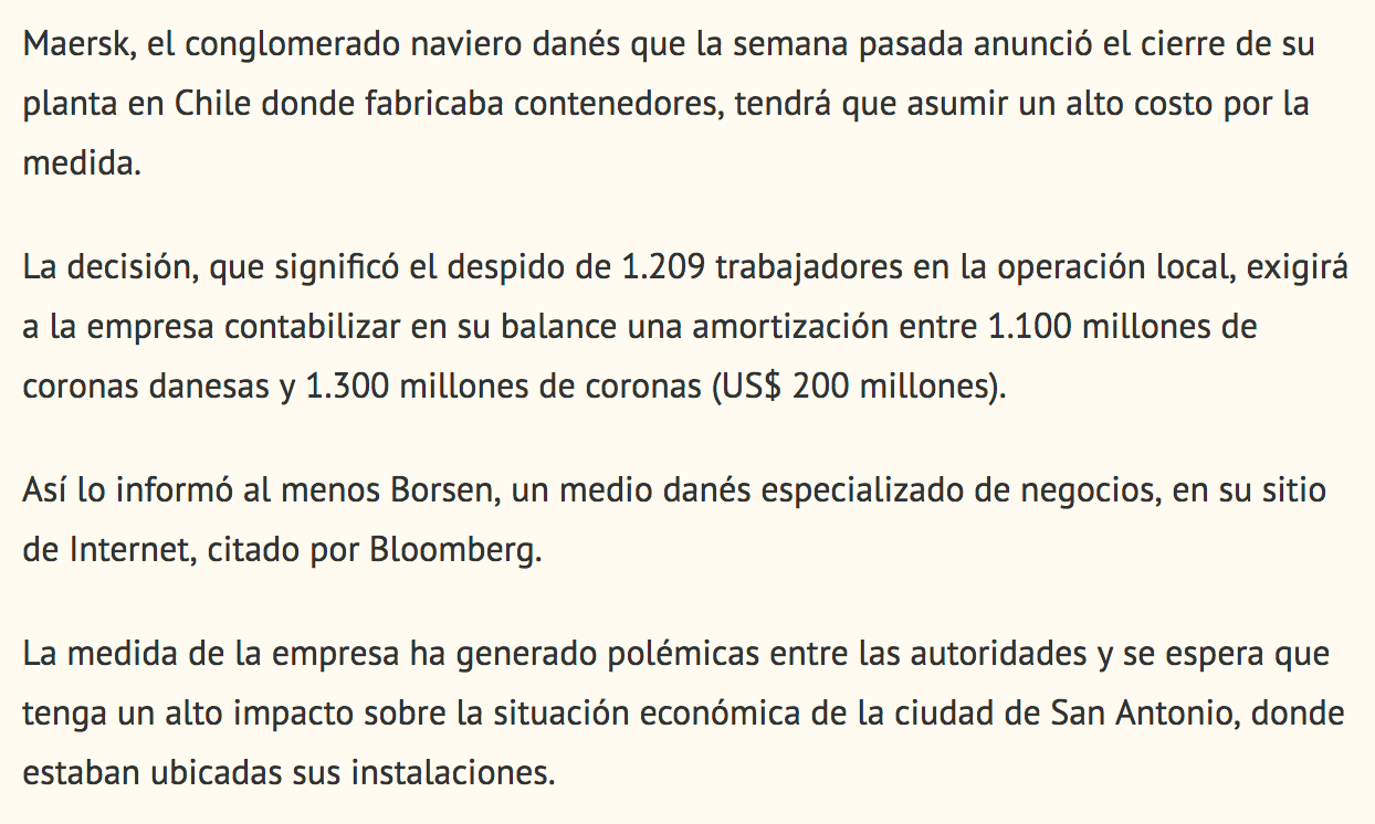 En Chile ha sucedido un acontecimiento dramático, con el cierre intempestivo de una planta de fabricación de containers especializados de la empresa danesa Maerks, con el anuncio del despido colectivo de toda su planta de 1,200 trabajadores.