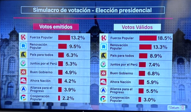 A menos de dos semanas de las elecciones vemos que las candidaturas de izquierda no pasan de 5 o 6%, mientras que los dos punteros, Keiko Fujimori -que viene subiendo- y Rafael López Aliaga -estancado- están por encima del 10%.