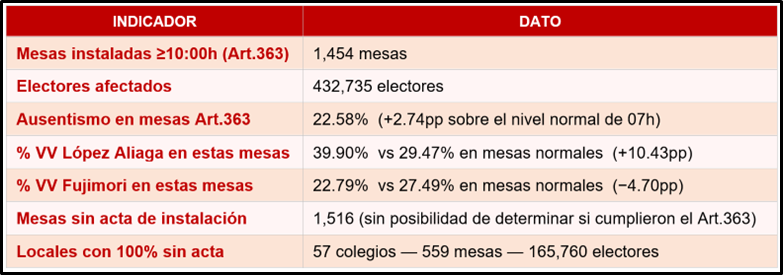 El único informe producido hasta ahora que estima cuantos votos que hubieran podido ir a Rafael López Aliaga no se produjeron por la tardanza en la apertura de las mesas de votación, lo ha elaborado Jaime Freundt, consultor Electoral de JFT & Político. Freundt analiza el impacto de la tardanza en la instalación de mesas sobre el ausentismo y los resultados electorales. Sus hallazgos se resumen en el siguiente cuadro: