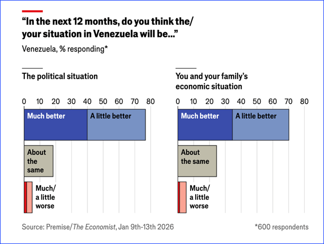 La incursión ha dado esperanza a los venezolanos. Antes de su captura, muchos temían estar atrapados con Maduro, posiblemente durante décadas. Ahora, casi cuatro de cada cinco creen que la situación política mejorará en un año. Casi la misma cantidad cree que su situación económica personal también habrá mejorado para entonces: la economía venezolana se contrajo un 70 % bajo el gobierno de Maduro.