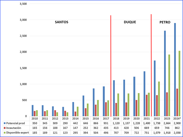 El hecho de una fuerte reducción de la erradicación de los cultivos de coca en Colombia, desde que ingresó Petro, dan como resultado una mayor expansión del área (nuevas áreas) y una mayor edad de los cultivos de coca en áreas sembradas, lo que determinaría una mayor productividad promedio de volumen de coca por hectárea.