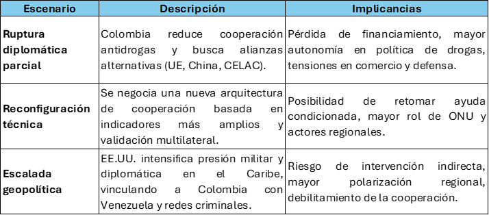 Esta situación plantea varios posibles escenarios, pero todos ellos se avizora un deterioro de la cooperación antidrogas, se mantendrá la tendencia de crecimiento de los cultivos de coca, Petro no cambiará su enfoque de la Nueva Política de Drogas. Esta es una situación coyuntural de corto plazo que es muy probable que cambie luego de las elecciones congresales y presidenciales en Colombia en el próximo año.