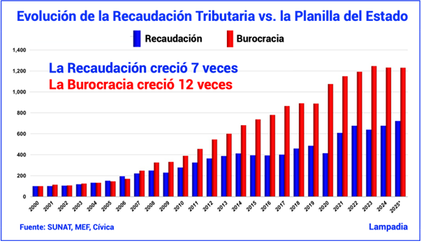 III. En el segundo período de socialismo, el más reciente y actual, con Humala, PPK, Vizcarra, Sagasti, Castillo, Boluarte, Jerí y Balcázar, no solo se paró la inversión minera (Conga, Tía María y las exploraciones), se llenó el Estado de funcionarios anti-empresa e inversión privada, se multiplicaron las trabas burocráticas para las inversiones y emprendimientos de ciudadanos y empresas, se aumentaron sin límite las planillas del Estado, de maestros, médicos, jueces y burócratas y se debilitó sustancialmente la sostenibilidad fiscal del país.