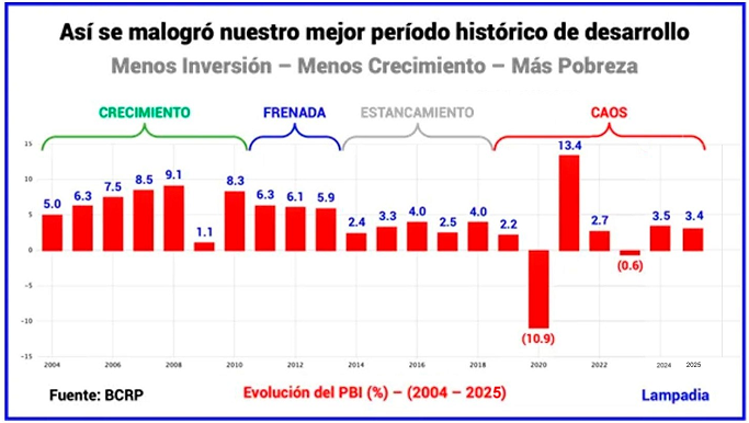 Este retroceso es el resultado del complot de las izquierdas que vieron al Perú dispararse hacia el desarrollo, con un sustancial nivel de crecimiento de la economía, las inversiones, las exportaciones y la clase media. Un ambiente donde la prédica de las ‘ideas muertas’ del socialismo latinoamericano dejaría de tener futuro.