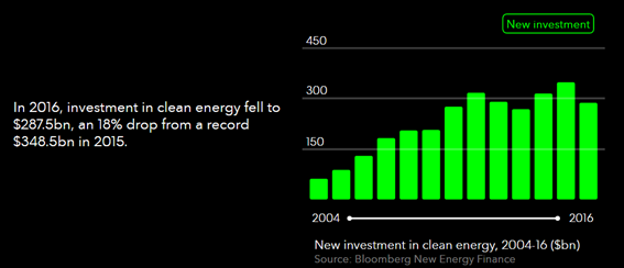 Las nuevas inversiones en energía limpia cayeron a US$ 287,500 millones el año pasado, un 18% menos que el récord de US$ 348,500 millones en 2015, según un nuevo informe de Bloomberg New Energy Finance (BNEF) titulado “Tendencias globales en la inversión en energía limpia”. El informe destaca que esta reducción en la inversión también se debe a la caída del costo de las fuentes renovables.