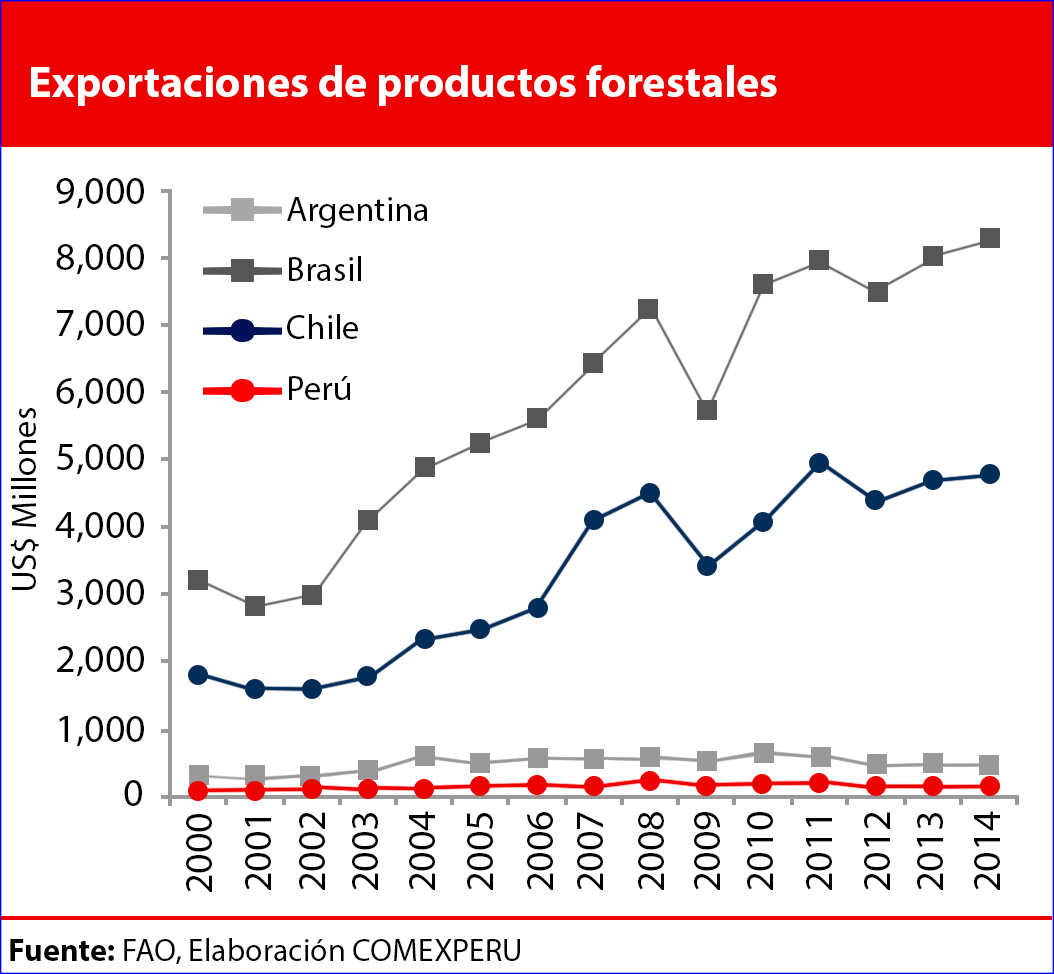 Sin embargo, la actividad forestal solo está siendo explotada en un nivel mínimo de su potencial. Alrededor de las 2,500 especies de madera que se encuentran en Perú, solo han sido clasificadas 600 y utilizadas 195. Esto se refleja en la pobre contribución del sector forestal a la actividad económica en el Perú, que alcanza sólo el 1.1% del PBI (al 2014), en comparación a lo registrado en Chile (2.6%), Bolivia (2.7%) o Ecuador (2.3%), que tienen una menor extensión de bosques. Chile cuenta con 16.1 millones hectáreas (menos de la cuarta parte de la superficie peruana de bosques naturales). Actualmente, Chile, que desarrolló su sector forestal en las últimas tres décadas, exporta productos forestales por unos US$ 7,000 millones anuales. El potencial del Perú, como hemos mencionado anteriormente, es por lo menos cinco veces el de Chile. Por lo tanto, nuestro maravilloso país podría exportar productos forestales por unos US$ 40,000 millones por año.