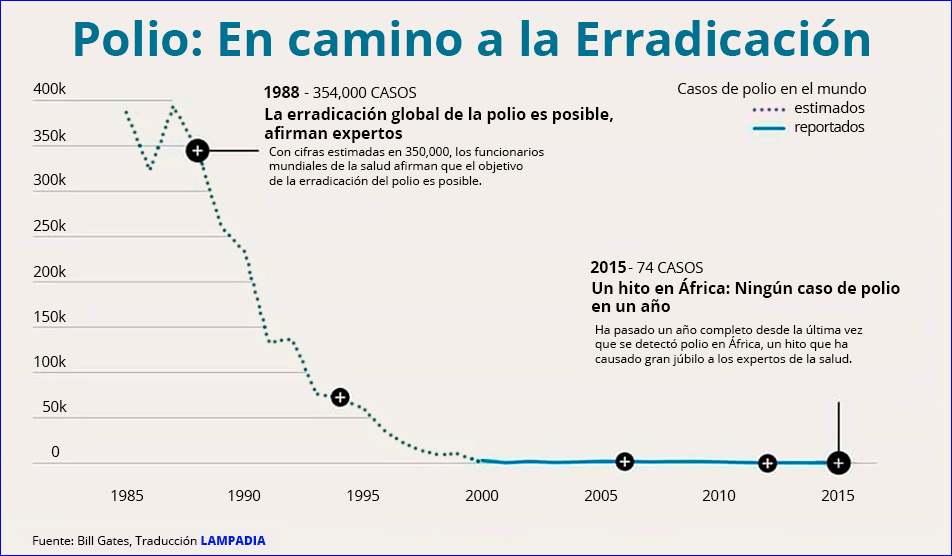 Además del tema tecnológico que revisaremos líneas abajo, el otro desarrollo espectacular en el África es el de la introducción de vacunas, medicinas, control de la malaria y el SIDA, con un apoyo muy importante de los nuevos filántropos. El siguiente cuadro de Bill Gates muestra el gran éxito que se está teniendo con la erradicación de la polio. Ver en Lampadia: Las buenas noticias de Bill Gates.