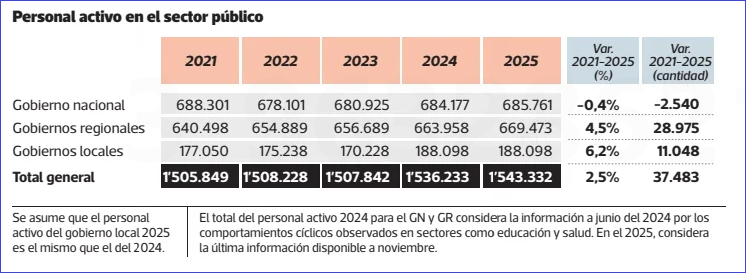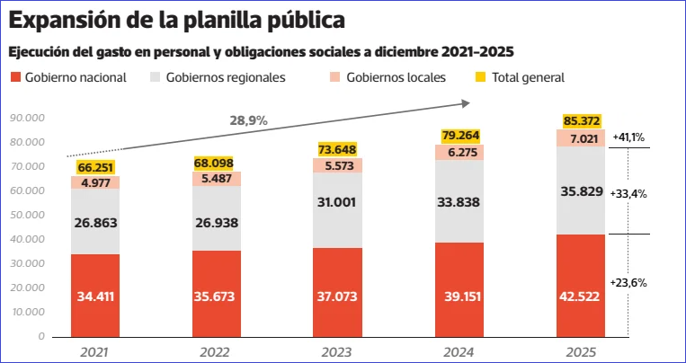 Durante cuatro años consecutivos, el número de empleados del sector público ha aumentado de manera constante. A diciembre de 2025, el ingreso promedio del sector público fue de S/3.688, una cifra 13% mayor que el ingreso promedio del sector privado (S/3.252). Al finalizar el 2025, el gasto en personal y obligaciones sociales (gasto en personal general, personal de carreras especiales y otros gastos) ascendió a S/85.372 millones, lo que representa un incremento de 28,9% respecto a lo que se gastó en el 2021 (S/66.251 millones).