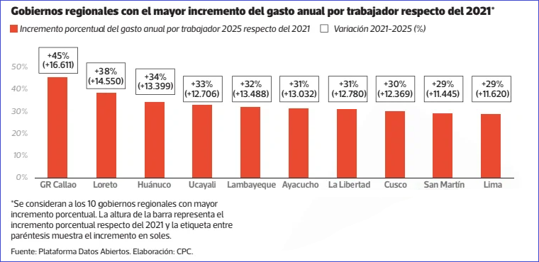 En cuanto al gasto anual por trabajador público, en el 2025 este valor ascendió a S/53.519 (+11.578), siendo 28% más que en el 2021 (S/41.941). Los GR con mayor incremento fueron el de Callao (+S/16.611), Loreto (+S/14.550) y Lambayeque (+S/13.488).