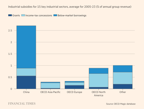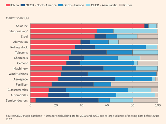 China ha incrementado su cuota de mercado en industrias que van desde la solar hasta la construcción naval y el acero, gracias a la tasa de subvenciones más alta del mundo.