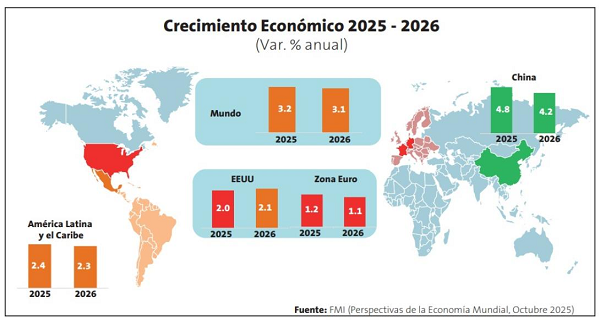 Para 2026, la economía global estaría creciendo en torno a un 3% sustentada por las economías emergentes de Asia. EE.UU. debería estar ligeramente por encima de 2%, mientras que Europa mantendría bajos niveles de crecimiento cercanos al 1%, Y que China ralentizaría su crecimiento más cerca al 4%. Por su parte América Latina tendría un crecimiento de 2.3%, muy parecido al de 2025.