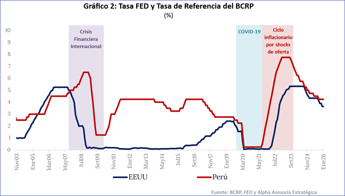 Pero hay algo más que se puede hacer. La tasa de referencia del BCRP está en 4.25%, no se movió en la última reunión (ver gráfico 2). Eso nos da una tasa real (descontando inflación esperada) de 2.1%, muy alta para una economía que ya alcanzó la meta de inflación y tiene una demanda interna débil. Por otro lado, la tasa de la FED está en 3.50%-3.75% y se espera que este año termine en torno a 3.00-3.25%. En su próxima reunión, el BCRP podría bajar su tasa directamente a 3.50% y esperar a la FED abajo y no ir acomodándose lentamente. No hay riesgo de inflación, fortalecería el crédito a empresas que se vienen recuperando lentamente y podría generar una mayor salida de capitales de corto plazo. ¡Cuando hay apuro es mejor bajar en ascensor que usar la escalera!
