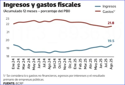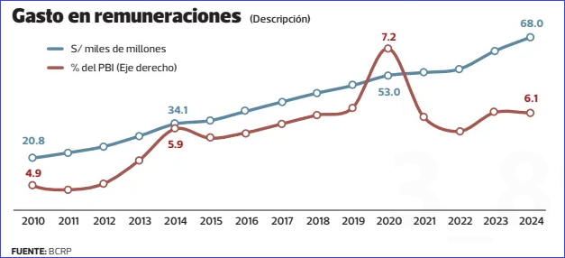 El crecimiento, en los últimos años, del gasto corriente, con un componente fuerte de pago de remuneraciones, es un «gran temor», anotó Carranza. Esto, pese a que se tiene un panorama fiscal positivo ante el pago de impuestos del sector minero.