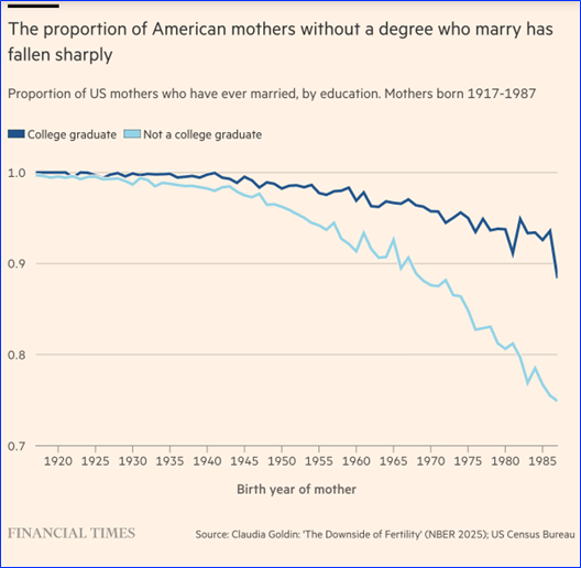 La cuestión, simple (y obvia), es que las mujeres con estudios que terminan asumiendo la responsabilidad total del cuidado de varios hijos tienen relativamente más que perder que sus pares sin estudios universitarios. Por eso son más propensas a insistir en el matrimonio. También es la razón por la que tienden a tener menos hijos (aunque esto también se debe a que empiezan más tarde).