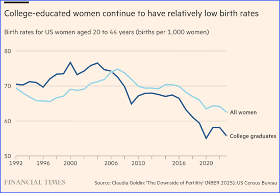 Goldin utiliza este análisis para explicar lo que ha estado sucediendo en Estados Unidos a largo plazo. Así, «la tasa de natalidad se desplomó hace algún tiempo en Estados Unidos… Debido a que las mujeres tenían mayor autonomía, tenían más opciones, y debido a que los ingresos relativos de los trabajadores con educación universitaria aumentaron considerablemente, sus opciones se volvieron más valiosas… El costo de oportunidad de tener hijos para las mujeres con mayor educación aumentó. Las mujeres necesitaban mayores garantías de que el cuidado de sus hijos se compartiría con el padre».