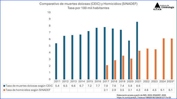 Eso es contradictorio con las estimaciones del CEIC, que ya en el 2021 registraban muertes dolosas por con una tasa de 8.6, muy por encima de lo que el SINADEF registra para estos últimos años.