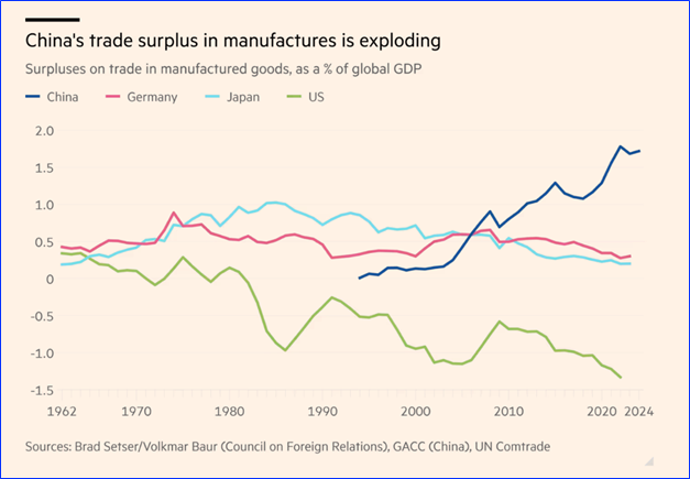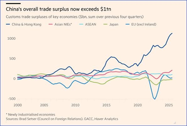 En los primeros 11 meses de 2025, China registró un superávit comercial aduanero de más de un billón de dólares. Según Brad Setser, del Consejo de Relaciones Exteriores, en 2025 en su conjunto, su «superávit general de bienes… debería, si se mide con precisión, acercarse a la asombrosa cifra de 1.2 billones de dólares (el 6 % del PIB de China, muy por encima de un punto porcentual del PIB de todos sus socios comerciales)».
