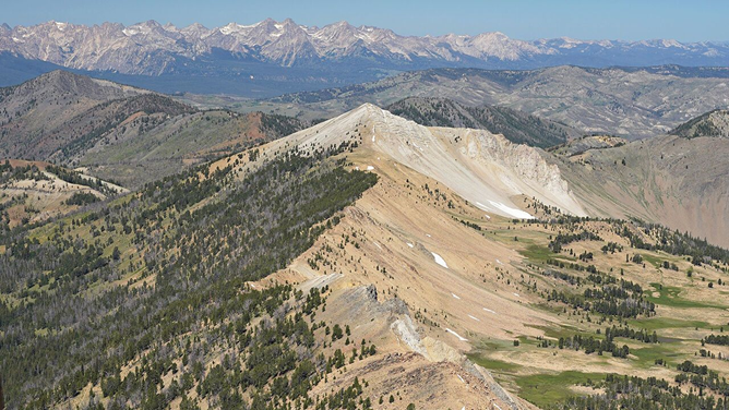 Muestra parte de Idaho. La ladera de la izquierda, orientada al norte, está cubierta de vegetación. La de la derecha, orientada al sur, no.