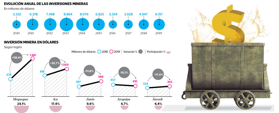 En tanto, la ministra de Energía y Minas señaló que en el 2019 la inversión minera ejecutada en el Perú fue de US$6.157 millones, y que para el 2020 se espera superar esa cifra y llegar a los US$6.300 millones de inversiones en el sector.