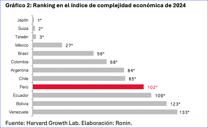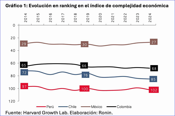 La posición del Perú en el ranking de complejidad económica refleja una realidad preocupante: a pesar del buen crecimiento económico de las últimas décadas, Perú no ha logrado transformar su matriz productiva y exportadora, manteniéndose anclado en la extracción de materias primas como el cobre y el oro, con bajo valor agregado y limitada transferencia tecnológica hacia el resto del tejido empresarial.