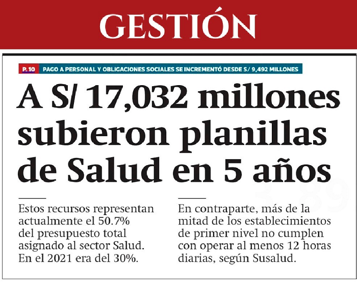 En cinco años, planillas de Salud subieron a S/ 17,032 millones